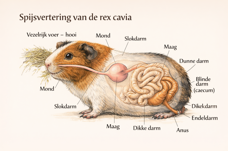 Op deze pagina lees je hoe de spijsvertering van de rex cavia werkt en welke rol voeding en vezels daarbij spelen. Zo ontdek je waar je op kunt letten om je cavia gezond te houden.